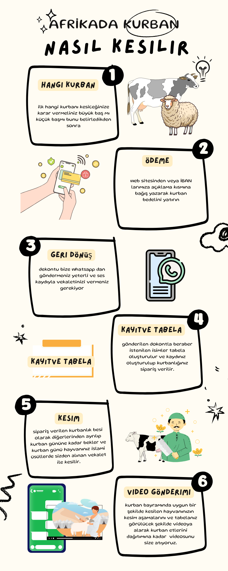 6.Kurban kesim sürecinin tamamlanmasının ardından, derneğimiz, kurban bağışçılarına WhatsApp üzerinden bir mesaj gönderir. Bu mesaj, kurbanın kesimine dair videoları ve fotoğrafları içerir, böylelikle kesimin gerçekleştiğini belgelendirir ve bağışçılara bu şekilde geri bildirim sağlar.